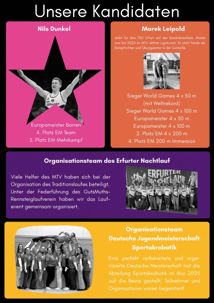 Bis zum Halbfinale der Deutschen Meisterschaft im März im hessischen Baunatal werden alle Gruppen und Solisten nun weiter fleißig trainieren. Eine kurze Weihnachtspause wird es geben, aber bis März sind weitere drei bis vier Turniere in ganz Deutschland geplant, um weiter an Erfahrung zu sammeln und als Teams zu wachsen. Wer diesen Prozess mit begleiten möchte, ist herzlich eingeladen, beim MTV einmal ins Training zu schnuppern. Gewachsene Strukturen benötigen auch immer mehr personelle Power. Deshalb sucht der MTV weiterhin nach motivierten Tänzerinnen und Tänzern in allen Altersklassen, Trainerinnen und Trainern besonders für die Jüngsten in der tänzerischen Frühförderung sowie Betreuerinnen und Betreuern, die mit Kreativität und Herz immer dabei sind. Der MTV ist erreichbar bei Instagram unter @tanzsport_mtv1860_ef oder per Mail unter tanzsport@mtv-erfurt.de.